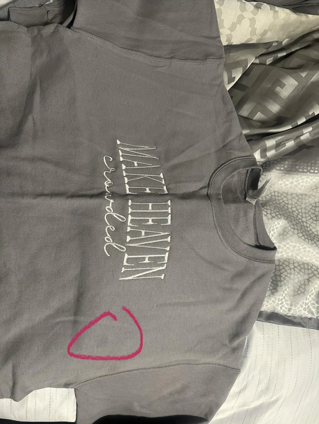 - Large embroidered "MAKE HEAVEN CROWDED" design