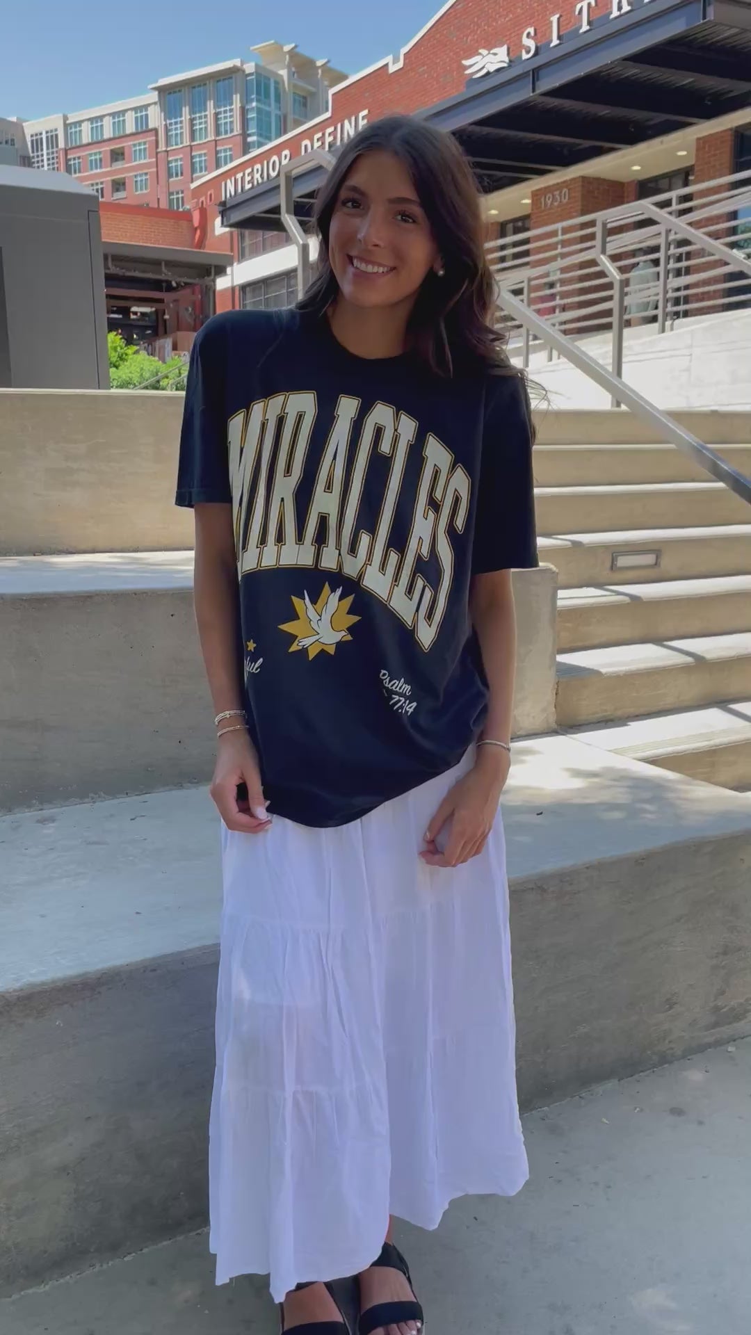 Our Miracles tee celebrates the wonder-working power of our God. This collegiate-style design features a beautiful dove emblem and scripture reference, creating the perfect blend of faith and modern style.